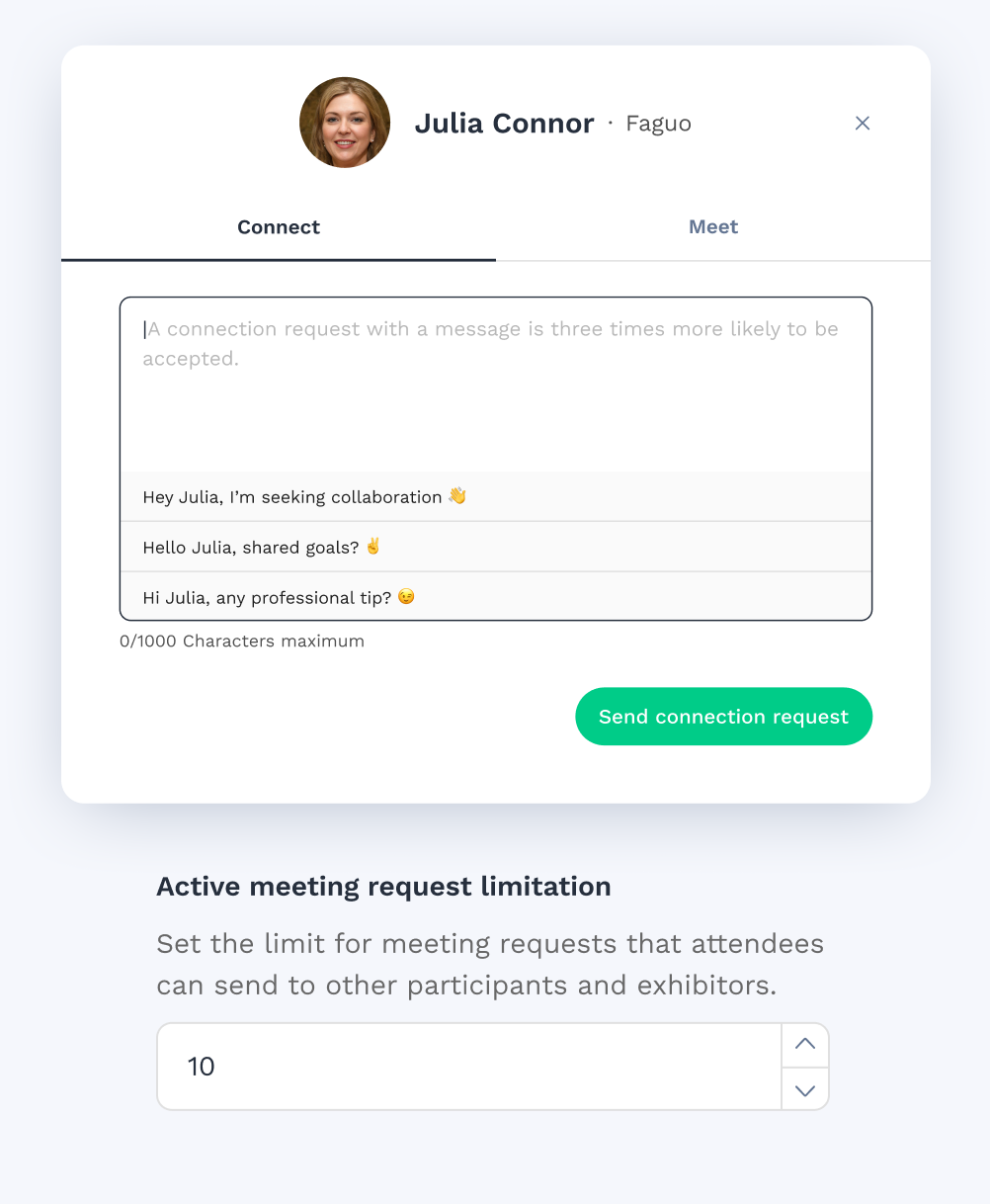 Book meetings instantly from profiles or exhibitor booths with one-click requests.